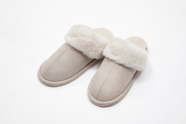 甲表にポリエステル生地を使ったセンターシームのムートンスリッパです。